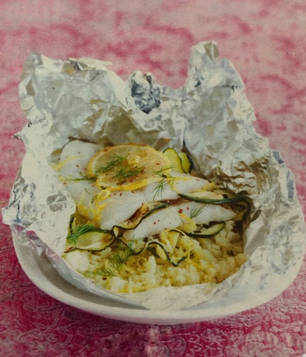 - troubu předehřejeme na 160°C, 4 velké kusy alobalu přeložíme na půl a po obvodu přehneme směrem vzhůru. Kůru z citronů smícháme s kuskusem, oříšky, cuketou a koprem, směs pak nasypeme rovnoměrně do otevřených balíčků. Nahoru položíme filé a na každou porci po 2 plátcích citronu. Šťávu z citronů smícháme s vývarem a rovnoměrně jím polijeme všechny balíčky. Utěsníme vršek a pečeme 20-25 minut.
