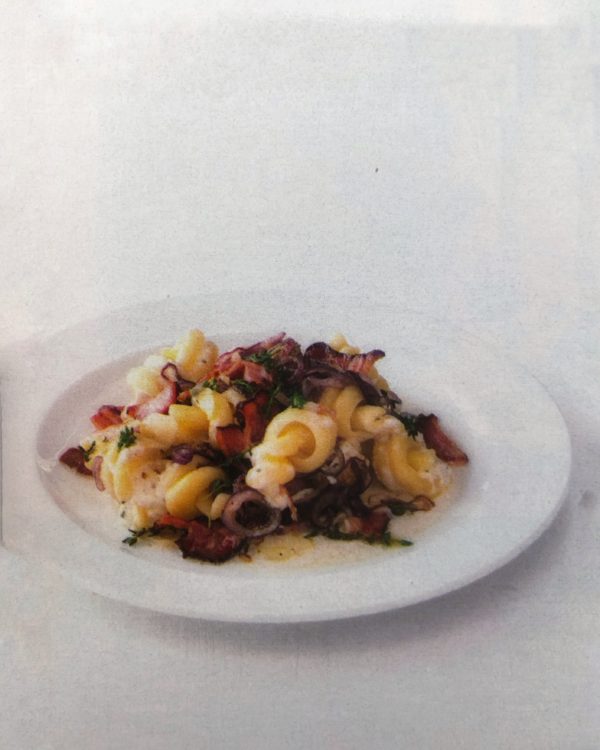 - Těstoviny uvaříme. Scedíme (125ml vody schováme) a udržujeme teplé. Slaninu vyškvaříme na olivovém oleji. Přidáme cibuli a opékáme cca 10 minut. Poté přidáme česnek a tymián. Na scezené těstoviny nadrobíme sýr, přidáme obsah pánve, odloženou vodu z těstovin a promícháme. Osolíme, opepříme a podáváme.