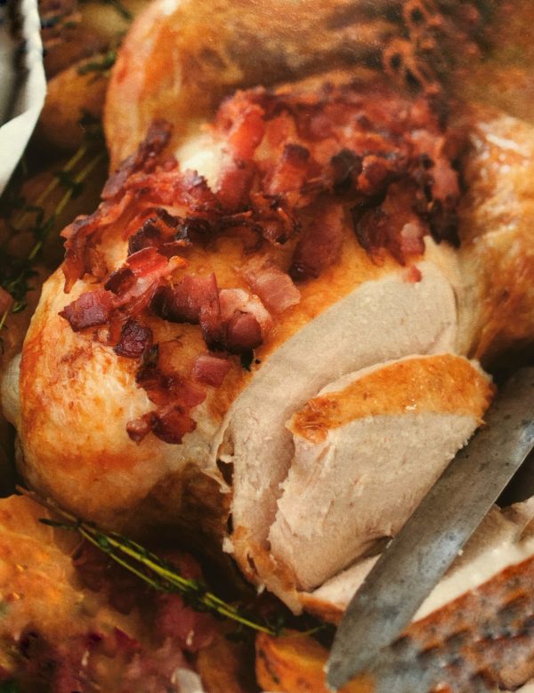 - Během pečení podléváme. Brambory oloupeme, nakrájíme na čtvrtky a po půlhodině je spolu se snítkami tymiánu přidáme ke kuřeti. Teplotu snížíme na 180°C a za stálého podlévání pečeme další hodinu.
