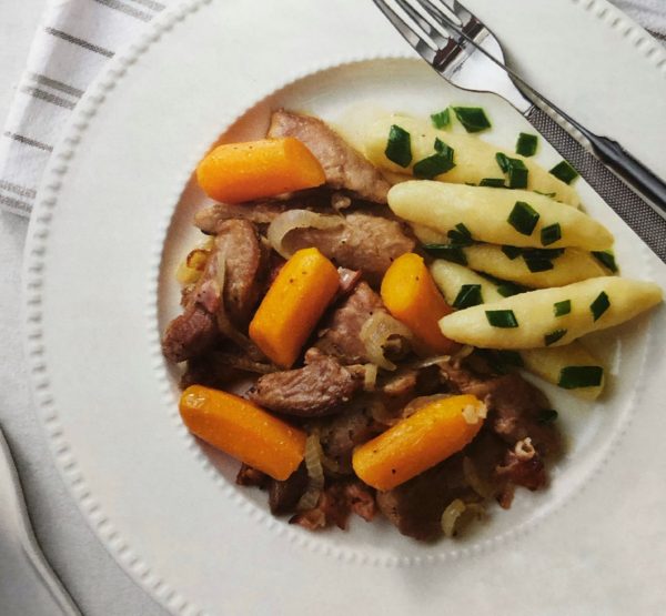 - Na mělký talíř naservírujeme 4–5 šišek a krůtí výpečky s mrkví a cibulí. Špenát podáváme zvlášť v misce.