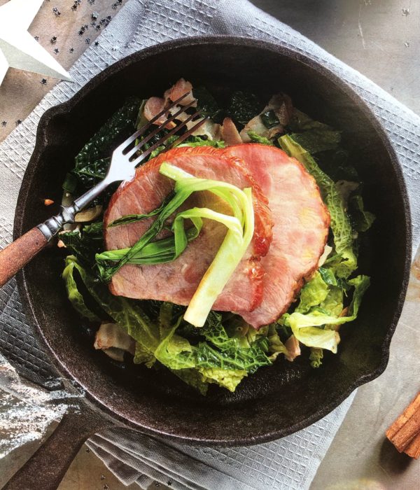 - Omytou kapustu rozebereme na listy, z nichž vykrojíme košťál. Nakrájíme na proužky a oblanšírujeme (krátce povaříme ve vroucí osolené vodě - asi 2 minuty). Scedíme, propláchneme studenou vodou a necháme okapat. V hrnci na troše oleje orestujeme slaninu nakrájenou na nudličky a česnek nakrájený na plátky. Přidáme nadrobno nasekaný tymián, rozmarýn nebo šalvěj a scezenou kapustu. Podle potřeby můžeme podlít trochou vody, ve které jsme oblanšírovali kapustu. Opepříme, osolíme a přidáme nadrobno nakrájenou lahůdkovou cibulku. Promícháme, zakryjeme pokličkou a dusíme na mírném ohni asi 5 - 8 minut.