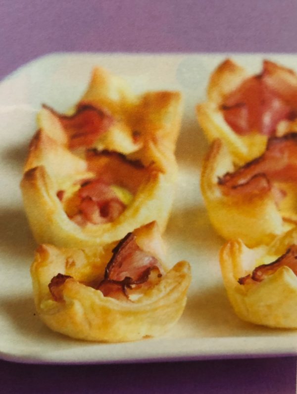 - Listové těsto rozválíme a vykrájíme na čtverce přibližně stejně velké jako kruhová dna form na muffiny. Každý otvor vyplníme těstem. Ušleháme vajíčka, smetanu a mléko, přidáme sůl, pepř a muškátový oříšek. Každý plátek slaniny rozpůlíme a rozdělíme je mezi koláčky. Rovnoměrně do všech rozlijeme i směs s vajíčky a nakonec každý posypeme sýrem. Pečeme cca 12 minut na 200°C.
