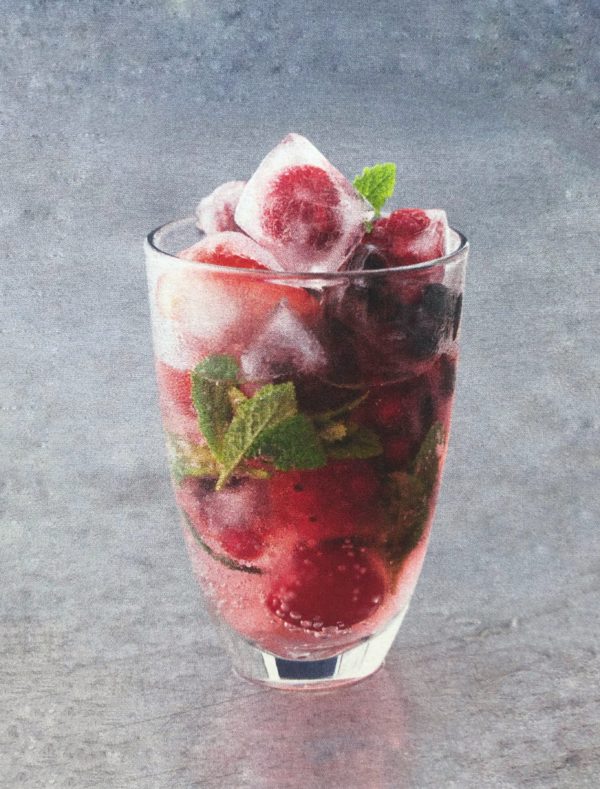 - Ovoce vyskládáme do jednoho až dvou tvořítek na led - spíše větších - zalijeme vodou a dáme zamrazit. Do poloviny 4-6 skleniček nalijeme tonic, přidáme pár lístků čerstvé máty a dosypeme ovocným ledem.