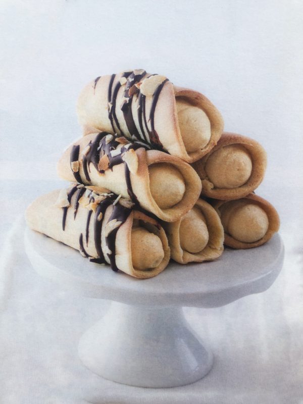 - Nejprve uděláme trubičky. Mouku smícháme se sodou a moučkovým cukrem a pak k suchým ingrediencím vmícháme vejce a med a vypracujeme tužší těsto. Necháme chvíli odpočinout , pak těsto rozválíme dotenka a vykrájíme kolečka. Ty namotáme na kovové trubičky a dáme péct do trouby na 180°C asi na 10 minut.