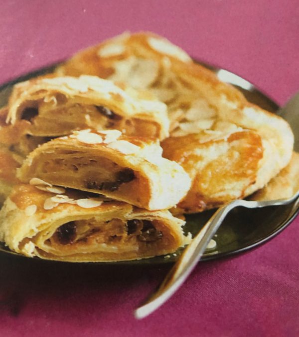 - Jablka smícháme s rozinkami, skořicí a cukrem. Pomoučněné listové těsto rozválíme a rozdělíme na 4 obdélníky. Doprostřed každého dáme čtvrtku jablek, těsto přehneme přes sebe a na koncích přitiskneme. Potřeme vejcem a pečeme při 180°C dozlatova. Chvíli před koncem opět potřeme a posypeme mandlemi.
