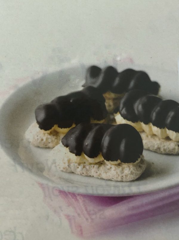 - Bílky s cukrem vyšleháme v parní lázni dohusta. Vmícháme ořechy a ze směsi tvarujeme pomocí sáčku na vymazaný plech oválky. Pečeme 15 minut při 120-150°C. Na vychladlé cukroví nastříkáme krém: mléko svaříme s krupicovým cukrem a oběma pudinky dotuha, po vychladnutí smícháme se změklým máslem a rumem podle chuti. Polijeme čokoládovou polevou.