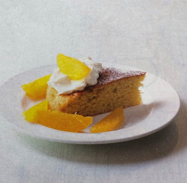 - Troubu předehřejeme na 180°C. Máslem vymažeme kulatou formu o průměru asi 20 cm.V míse smícháme mouku, krupicový cukr + 2 lžíce cukru extra, prášek do pečiva, sodu a sůl. Poté vmícháme jogurt, ,olej, kůru i šťávu z pomeranče, vejce a vanilkový extrakt. Vlijeme do formy a pečeme asi 25 minut. Necháme zchladnout. Podáváme s kopečkem jogurtu, s oloupanými dílky pomeranče smíchanými se zbylým cukrem a nudličkami z pomerančové kůry, zasypané moučkovým cukrem.