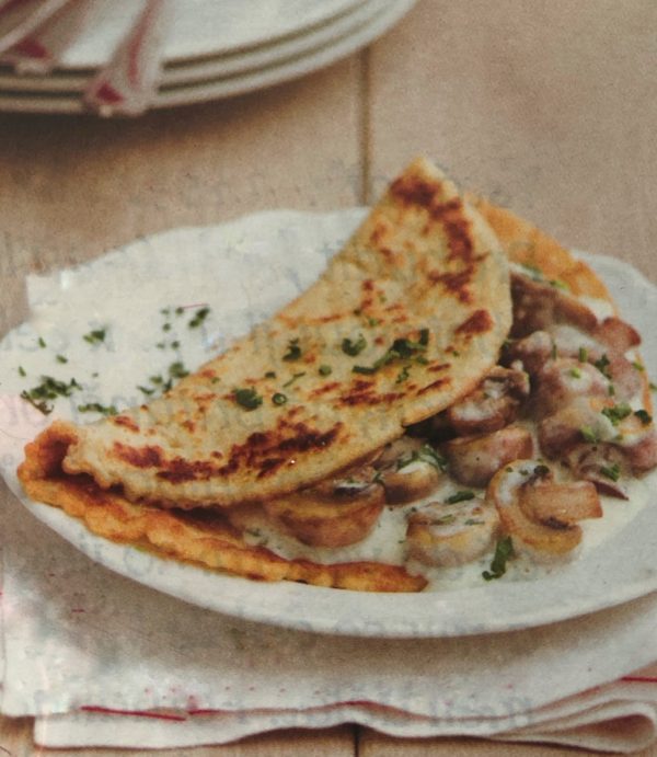- Žampiony podusíme doměkka na pánvi na oleji s česnekem a petrželkou. Mezitím si připravíme bešamel: máslo rozpustíme v rendlíku, přidáme hladkou mouku, necháme ji lehce osmahnout a za stálého míchání přiléváme pomalu mléko - tolik, aby vznikla hustší kaše. Chvilku ji za stálého míchání povaříme, potom bešamel nalijeme na změklé žampiony, promícháme, přidáme sůl, koření, chvíli dusíme a nakonec směsí naplníme teplé palačinky.