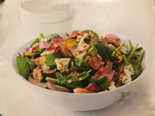 - Rozehřejeme pánev a nasucho v ní opečeme slaninu dokřupava. Přihodíme houby a 5 min opékáme. Připravíme si zálivku. Prošleháme hořčici, ocet a lžíci oleje s kapkou vody. Upečené brambory s cibulí dáme do mísy spolu s houbami, slaninou a špenátem, promícháme, zalijeme dresinkem a protřeseme. Rozdělíme na talíře a posypeme sýrem.