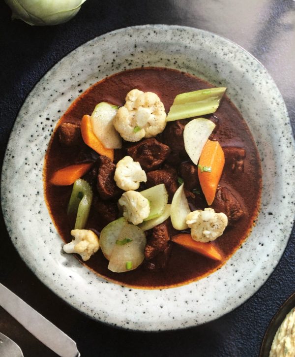 - Mrkev, květák, kedlubnu a řapíkatý celer nakrájíme na přibližně stejně velké kousky a uvaříme ve vroucí osolené vodě doměkka. (Řapíkatý celer vložíme do vody o 2 minuty později než ostatní kořenovou zeleninu.) Poté scedíme a necháme okapat. Zeleninu orestujeme v rozehřáté pánvi na lžíci másla. Nakonec osolíme, opepříme a lehce promícháme. Servírujeme v hlubokém talíři a kaši dáváme zvlášť.