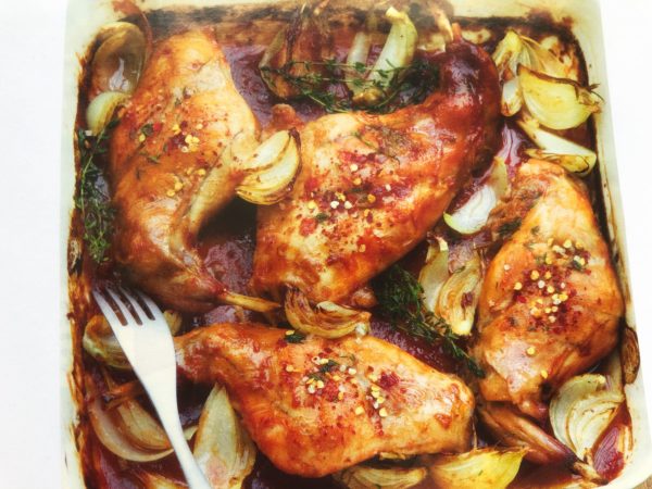 - Předehřejeme troubu na 200°C. Maso naporcujeme, osolíme a v pekáči zasypeme cibulí. Pak připravíme zálivku - všechny ingredience pořádně promícháme vidličkou. Zalijeme jí králíka, přikryjeme pokličkou a nejdříve asi 20 minut dusíme. Dopečeme odkryté. Na posledních pár minut přidáme snítky tymiánu. Podáváme s rýží.
