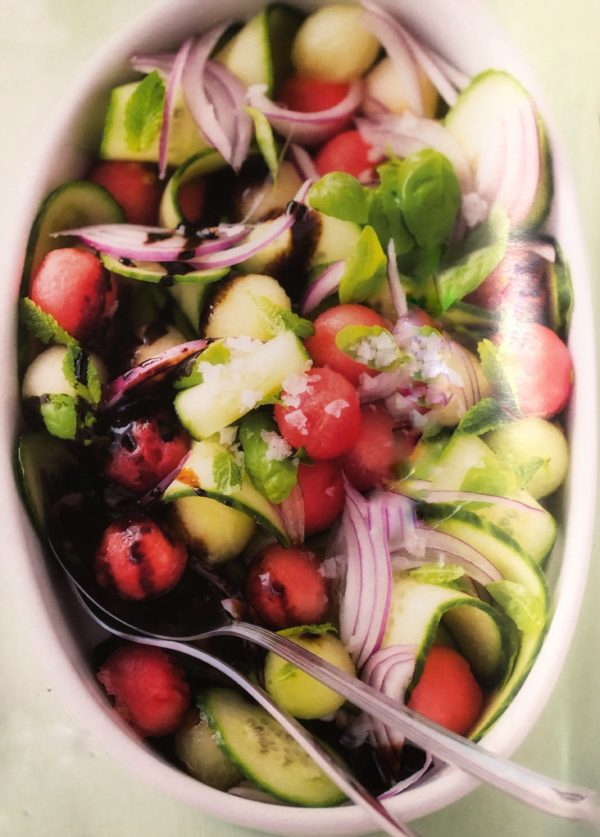 - Z obou melounů uděláme pomocí tvořítka kuličky a ve velké míse je smícháme s okurkou a cibulí. Lehce osolíme, zastříkáme balzamikem a ozdobíme bazalkou a mátou.