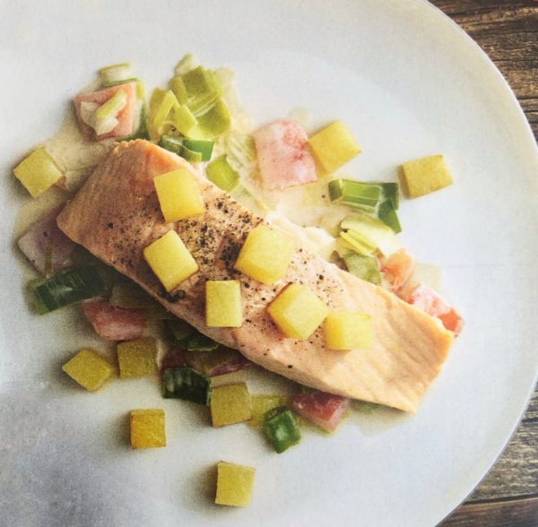 - Na talíř servírujeme nejprve krémový pórek, na něj položíme pošírovaného lososa a bramborové kostičky. Nakonec můžeme dozdobit lístkem čerstvé bazalky.