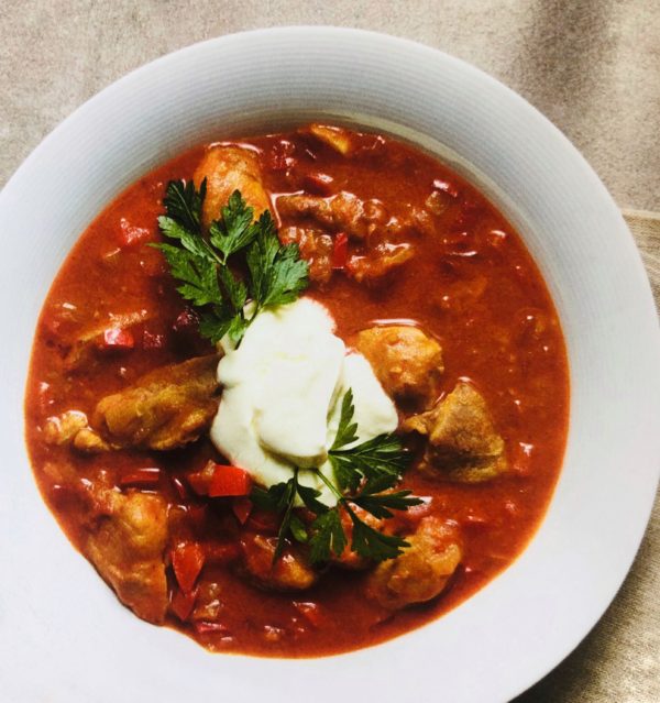 - Vykostěná krůtí stehna osolíme, opepříme a posypeme hladkou moukou. Maso orestujeme v rozpálené pánvi na troše rostlinného oleje ze všech stran dozlatova a vyjmeme na talíř. Do výpeku přidáme cibuli nakrájenou nadrobno a česnek nakrájený na plátky. Po orestování přidáme na kostičky nakrájené červené papriky a oloupaná rajčata a dusíme 5-10 minut. Přisypeme mletou papriku a promícháme. Podlijeme scezeným vývarem, přidáme 4 bobkové listy a orestované maso. Zmírníme plamen a pod pokličkou dusíme asi 40 minut doměkka.