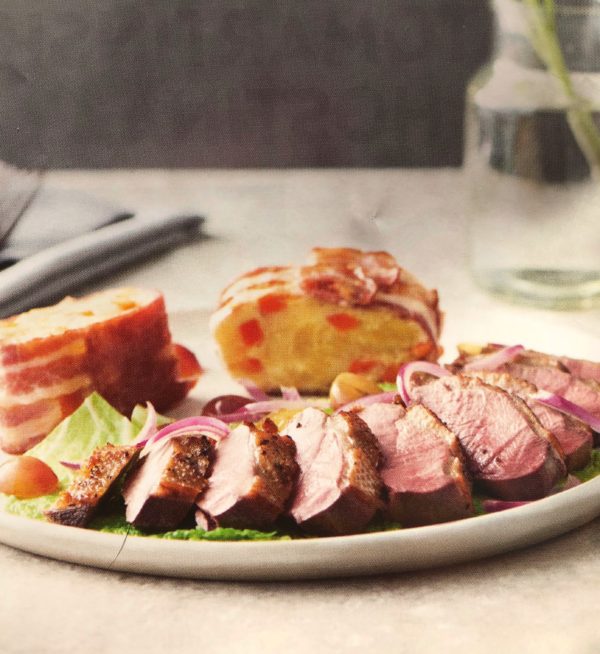- Před servírováním opečeme v pánvi na oleji plátky bramborové teriny. Husí prsa nakrájíme na tenké plátky proti vláknu a podáváme.