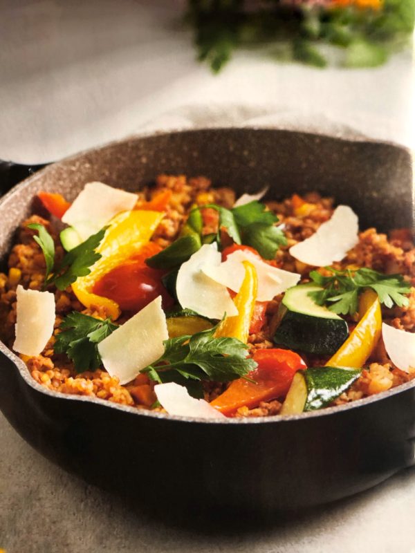 - Hotový pokrm ozdobíme orestovanou paprikou a cuketou, posypeme nasekanou listovou petrželí a hoblinkami sýru grana padano.