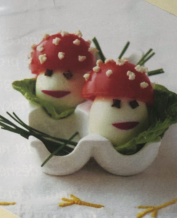 - Vajíčkům odřízneme užší vršek tak, aby se daly vyjmout žloutky. Rajčata rozpůlíme a lžičkou vydlabeme dužinu. Smícháme sýr, rozdrobené žloutky a nasekanou rajčatovou dužinu, přidáme pažitku, šunku, cibuli pepř a sůl podle chuti a dobře promícháme. Sýrovou směsí naplníme vydlabaná vajíčka. Přiklopíme je půlkami rajčat a ozdobíme. Majonézou uděláme muchomůrkám skvrny na kloboučku, z hřebíčku oči a z ředkviček pusy.