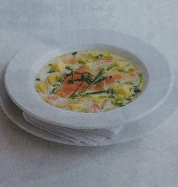 - Máslo rozehřejeme ve velkém hrnci, přidáme pórek a bobkový list. Za občasného míchání opékáme 8-10 minut, aby pórek alespoň trochu změkl. Přidáme brambory, vlijeme vývar i smetanu a necháme 10-15 minut probublávat, dokud brambory nezměknou. Vmícháme asi dvě třetiny lososa, ochutíme solí a pepřem. Podáváme posypané zbylým lososem a nastříhanou pažitkou.