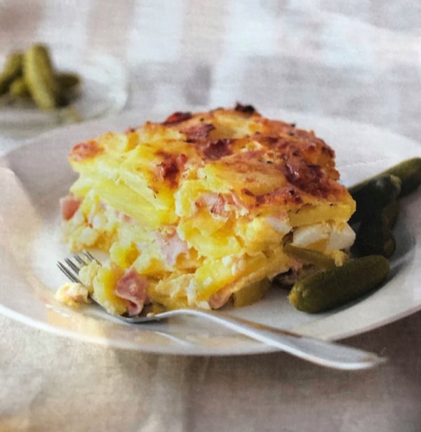 - Uvařené brambory pokrájíme na plátky. Dáme je do máslem vymazaného pekáčku - prokládáme je nakrájeným salámem, cibulí a 2 vejci natvrdo. V misce rozkvedláme zbylé vejce, smetanu, nastrouhaný sýr a obě hořčice. Osolíme, opepříme podle chuti a směsí zalijeme brambory. Pečeme při vyšší teplotě - 200°C dozlatova. Podáváme s okurkou.