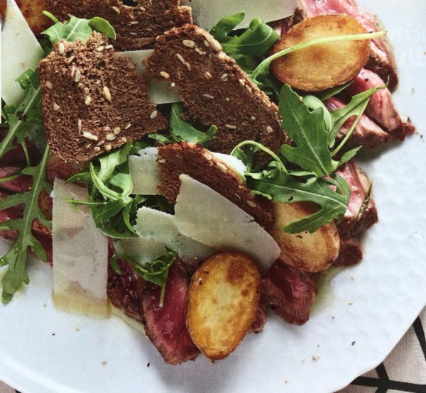 - Na mělký talíř naservírujeme 1 nakrájený steak, navrch položíme několik opečených brambor, hrst rukoly, hoblinky parmazánu a přelijeme dresinkem. Navrch poskládáme chlebové chipsy.