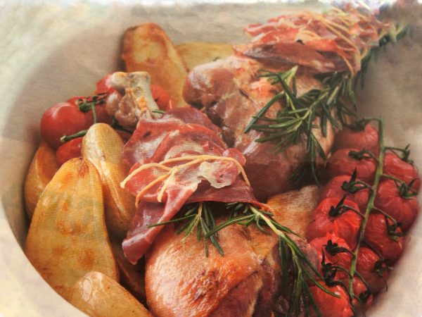 - Stehna osolíme a opepříme. Potřeme je olivovým olejem a spolu se snítkami rozmarýnu obalíme plátky slaniny (můžeme svázat provázkem). Položíme do pekáčku, poklademe plátky másla, zastříkáme olejem, mírně podlijeme a dáme na hodinu a půl péct do trouby při 180°C. Podléváme. Po půlhodině přidáme do pekáče i omyté a přepůlené brambory a větvičky cherry. Dopečeme dohromady.