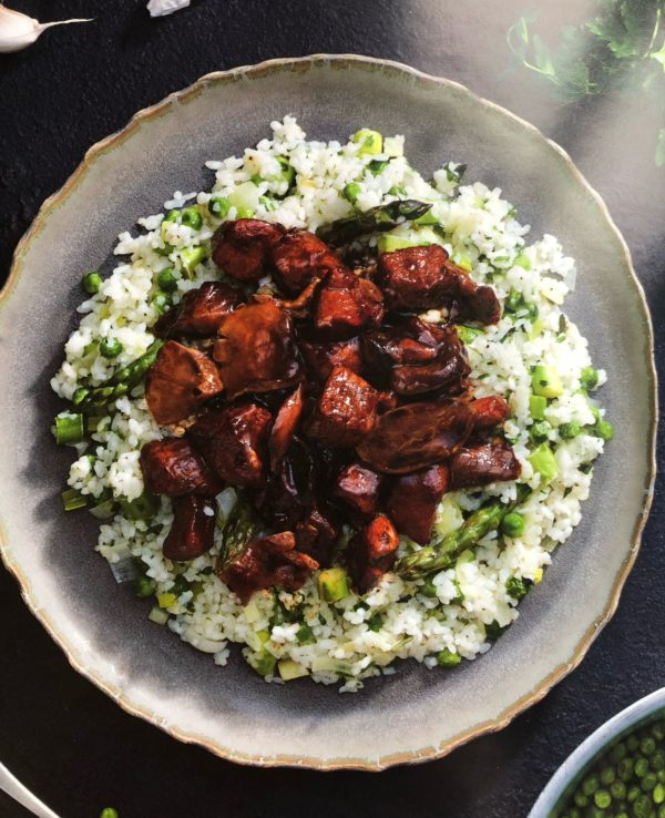 - Na mělký talíř naservírujeme porci rýže s chřestem a hráškem. Do středu přidáme dušené vepřové kostky s balsamicem a houbami.