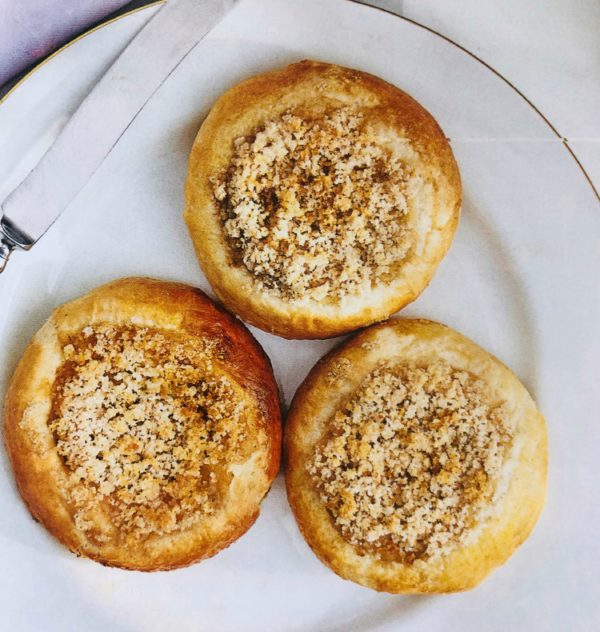 - Odložené těsto vyválíme na pomoučněné ploše na tloušťku cca 3mm. Nakrájíme čtverečky cca 4x4 cm a doprostřed každého čtverečku dáme náplň. Na tvarohovou ještě přidáme rozinku. Čtvereček poté zabalíme do šátečku. Pečeme v troubě na 180°C cca 16 minut do zrůžovění.