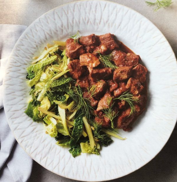 - Do hlubokého talíře naservírujeme porci restovaného fenyklu s kapustou a vedle dušené vepřové kostky na víně. Jídlo před podáváním ozdobíme fenyklovou natí.