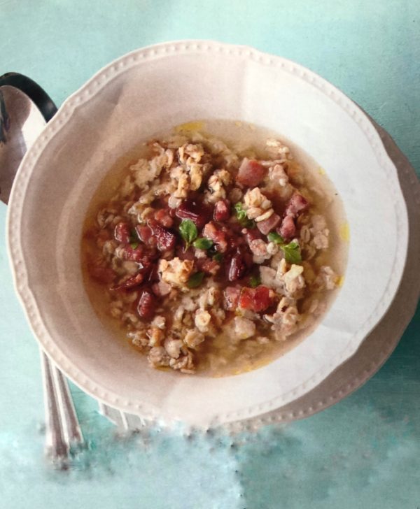 - V hrnci na polévku vysmažíme kostičky slaniny. Pak do hrnce vsypeme ovesné vločky a lehce je opražíme. Trvá to 3-4 minuty. Nakonec na vločky vyklepneme vejce, zamícháme a trochu osolíme. Vznikne tak vločková praženice. Tu zalijeme teplým vývarem a přidáme nadrobno nasekaný česnek. Povaříme, dosolíme podle chuti a přidáme majoránku.
