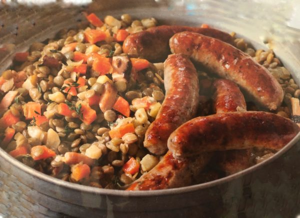 - Čočku propláchneme a necháme přes noc namočenou. Vodu slijeme a v nové čočku vaříme hodinu do změknutí. Rozpálíme gril a 15-20 minut ogrilujeme klobásky. Mezitím nasekáme cibuli, mrkev a celer na malé kousky. Olej rozpálíme na pánvi, přidáme slaninu a 2 minuty ji opékáme. Přidáme zeleninu a tymián.
