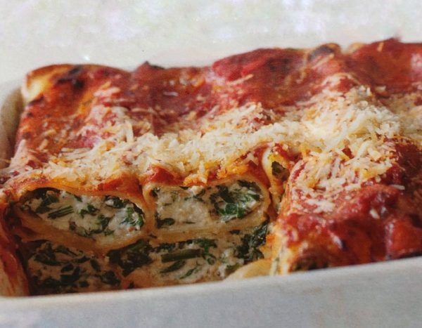 - Čtvrtinu rajčatové omáčky dáme na dno zapékací mísy o rozměru 20x30 cm. Lasagne mírně povaříme, jednotlivé listy položíme na pracovní plochu, na každý plát dáme kousek náplně, zarolujeme a položíme do mísy spojem na dno. Navrch dáme zbylou rajčatovou omáčku, posypeme zbylým parmazánem a pečeme 25-30 minut.
