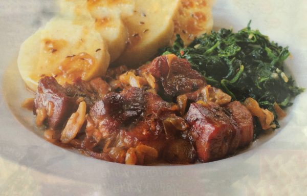 - Maso odkrojíme od kosti a pokrájíme na kostky, osolíme, okmínujeme, dáme do pekáče a promícháme s plátky cibule a česneku. Podlijeme pivem a cca 100 ml vývaru. Poté dáme do trouby předehřáté na 180°C a pečeme minimálně hodinu doměkka a zlatohněda. Při pečení podléváme výpekem, popř. vývarem.
