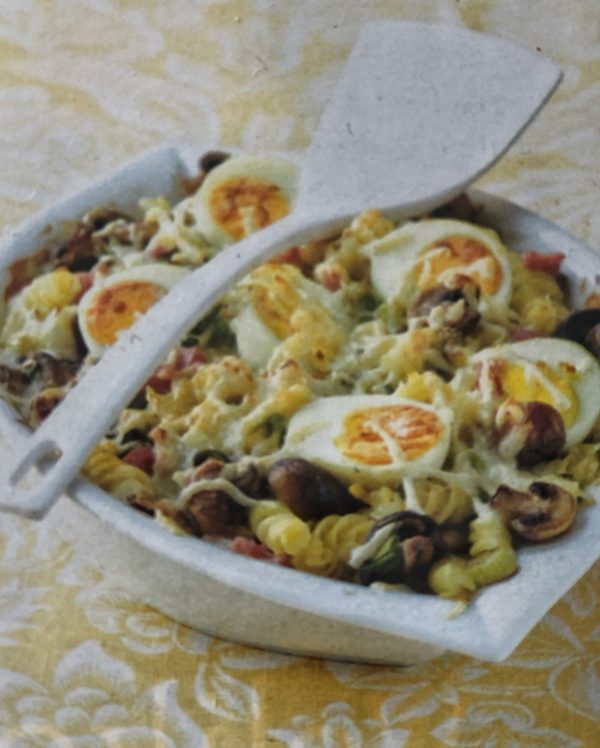 - Předehřejeme troubu na 180°C. Na másle orestujeme žampiony a pak zvlášť i většinu cibulky. Smetanu pět minut povaříme s česnekem a bazalkou. Necháme ji zchladnout, přidáme šunku, většinu sýru, osolíme a opepříme podle chuti a dobře promícháme. Těstoviny, houby a vejce rozložíme do zapékací mísy a přelijeme je smetanovou zálivkou. Posypeme zbylým sýrem a cibulkou a dáme na 10 minut zapéct.