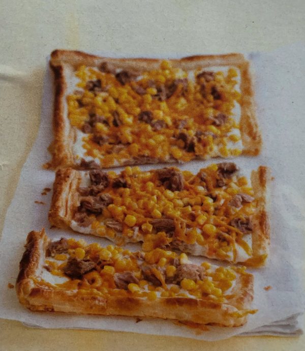- Troubu předehřejeme na 220°C. Listové těsto rozválíme na pečicím papíru a přeneseme na plech. Konce mírně zarolujeme dovnitř, aby se vytvořil okraj. Těsto po celé ploše propícháme vidličkou a dáme na 10-15 minut zapéct do trouby. Mezitím smícháme tuňáka a kukuřici a podle chuti osolíme. Těsto potřeme zakysanou smetanou, na ni rozprostřeme směs, posypeme sýrem a pečeme dalších 10-15 minut.