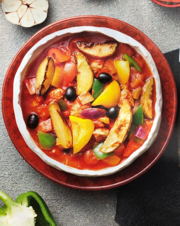 - Omyté a osušené maso osolíme, opepříme, poprášíme moukou a opečeme v rozpáleném hrnci na troše rostlinného oleje dozlatova. Přendáme do misky a k výpeku přidáme trochu olivového oleje, nadrobno nakrájenou cibuli a na plátky nakrájený česnek. Podle potřeby můžeme přidat trochu vývaru a restujeme dozlatova. Ochutíme bobkovým listem a nasekaným čerstvým tymiánem, přidáme rajčatový protlak, rajčata a orestované vepřové kostky. Vývaru přilijeme jen tolik, aby bylo maso zakryté, a dusíme na mírném plameni pod pokličkou doměkka. Před dokončením přidáme olivy.
