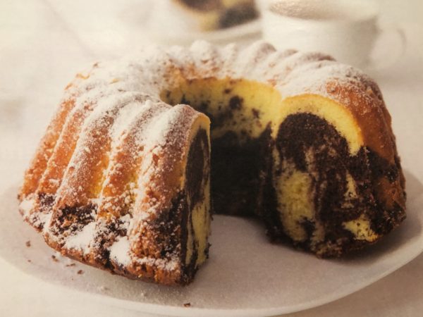 - Polovinu těsta vlijeme do formy, do druhé poloviny vmícháme kakao a těsto prostředkem kruhu vlijeme do formy. Vařečkou nebo lžící zanořte od středu ke kraji tmavé těsto do světlého.