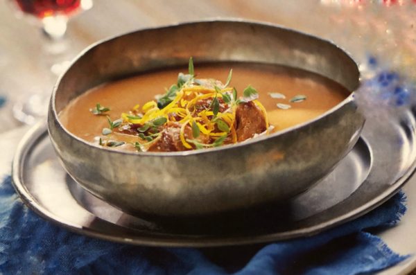 - Maso vyjmeme z omáčky a dáme do mísy. Do omáčky přidáme francouzské máslo a důkladně promícháme metličkou. Dochutíme nastrouhanou pomerančovou a citrónovou kůrou a necháme povařit cca 10-15 min. Poté omáčku propasírujeme přes sítko, vrátíme zpátky maso a necháme provařit. Nakonec přidáme sekanou petrželku.