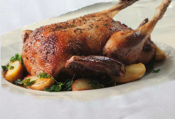 - Na počátku pečení necháme kachnu odklopenou, aby se maso zatáhlo. V momentě, kdy chytí barvu, pekáč přiklopíme a teprve na poslední hodinu opět odklopíme, aby se udělala kůrčička. Během celého pečení potíráme kachnu směsí vína a medu i výpekem. Půl hodiny před dopečením přidáme do pekáče i zbylá jablka, nakrájená na dílky.