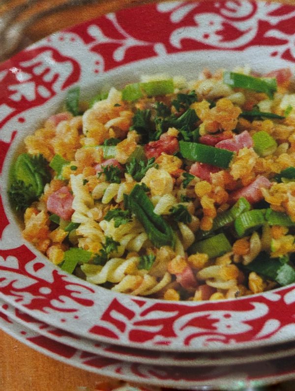 - Cibuli s česnekem osmahneme na oleji, přidáme šunku, pórek, krátce opečeme, nakonec přidáme vývar a čočku a vaříme osm minut. Pak necháme vše odstát, aby čočka změkla. přebytečnou vodu scedíme, připravíme si zálivku a nakonec všechno smícháme a necháme ještě asi 15 minut uležet.