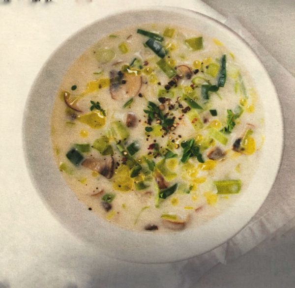 - V hrnci rozehřejeme máslo a opečeme na něm doměkka pórek, cca 5 minut. Přimícháme žampiony a společně mícháme dalších 5 minut. Potom přidáme česnek, minutu opékáme a nakonec vše zaprášíme moukou. Půl minuty mícháme. Zalijeme studeným vývarem, přidáme tymián, osolíme, opepříme a přivedeme k varu. Povaříme cca 10 minut.