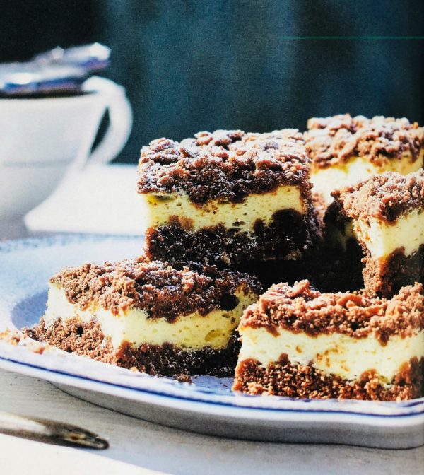 - Plech nebo velký pekáč vymažeme máslem a vysypeme moukou. Ztuhlé těsto rozkrojíme na polovinu, nastrouháme nahrubo a rovnoměrně rozprostřeme na plech. Na nastrouhané těsto rozetřeme náplň a na ni nastrouháme zbytek těsta. Pečeme 45 minut v troubě na 170°C. Koláč k podávání posypeme moučkovým cukrem
